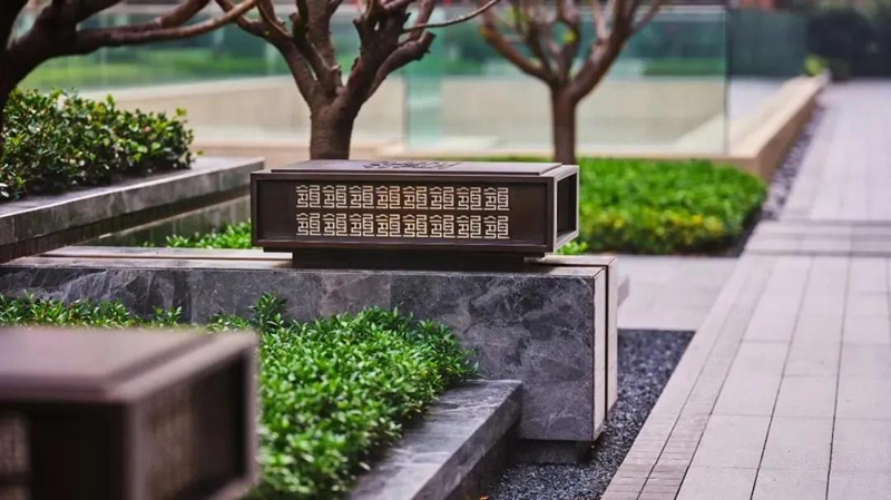 正弘瓴筑東門是園區重要的景觀節點,我們在此處栽種了品種豐富的植物,并通過“框景”造法結合深褐色拉絲不銹鋼材質營造出極具質感的圓形月洞門,增加了該區域景觀的層次感。洞門中由羅漢松坐鎮,以時令鮮花點綴,如此匠心工藝即使天氣轉寒也壓不住花開爛漫、迎客熱誠。鏡面水景配以線形流水,營造出東方古韻的雅致禪意。