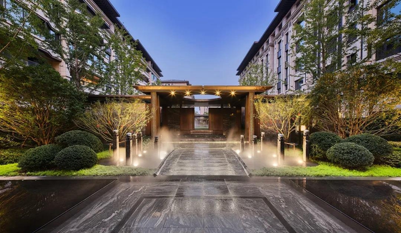池水邊景亭采用深色材料,營造出建筑的古典形態,達到舒緩城市喧囂的氣氛。霧森系統的負離子功效,讓空氣更為清新,有利于業主的身心健康。