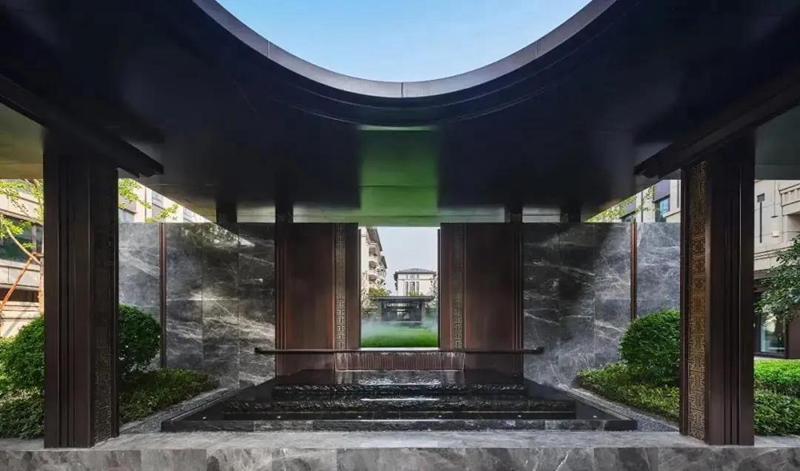 院門作為府邸入口的第一印象,在整個園區景觀營造中有著舉足輕重的地位。為更好展現出正弘瓴筑TOP級豪宅的尊貴典雅,大門處背景墻采用芭蕉黃石材干掛,兩側栽種了擁有百年樹齡的羅漢松,在展現出入門禮序的同時,避免了高大門頭所帶來的壓迫感,磅薄大氣盡顯無疑。