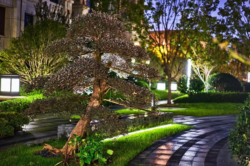 本次景觀改造對宅間綠植也做了明顯提升。和傳統園林相比,改造后的景觀效果顯得自然稟賦更為優化。除了栽種諸多與豪宅定位相匹配的名貴喬木,烏桕、樸樹、紫薇、晚櫻、臘梅等等;在組團搭配上,我們還增添了細葉芒、蒲葦、腎蕨和黃金串錢柳等,利用不同形態的苗木枝脈,營造出綠波交錯,建筑藏于園中的景觀體驗。地面鋪裝采用芝麻黑燒面碎拼而成,讓步道更為曲徑悠長,耐人尋味。