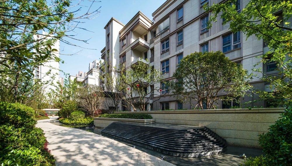 本案的精筑軸整體通過造景手法(藏景、框景、障景)、材料、色調、裝飾融入當地徽派文化的氣質。并做到因地制宜,采用五重景觀,最大限度地豐富了綠量,仿佛讓人置身于城市山林之中。