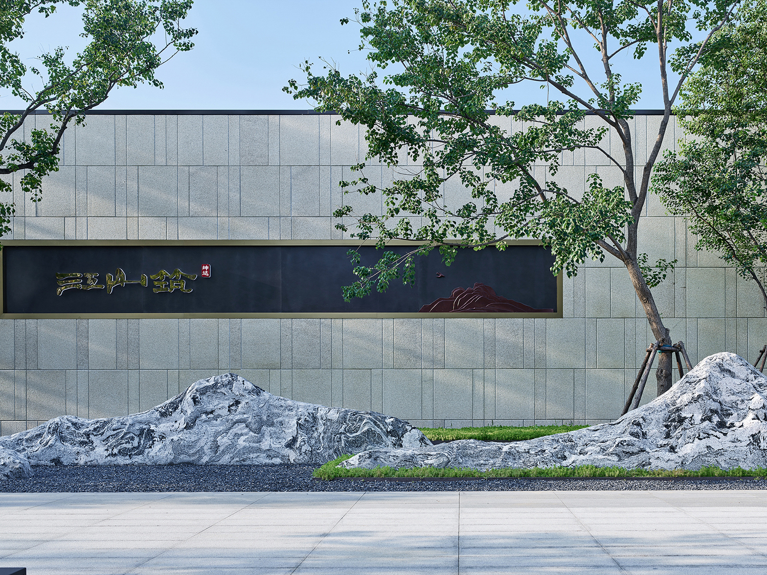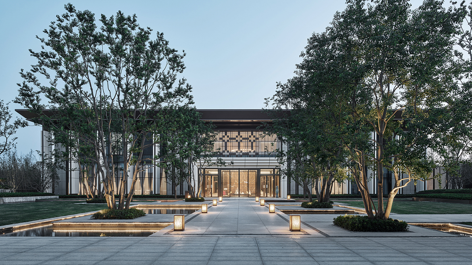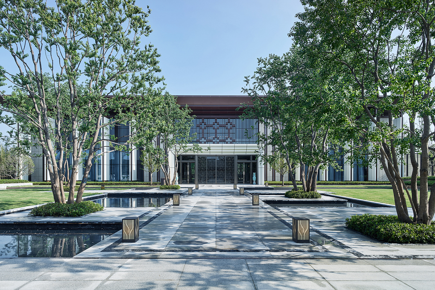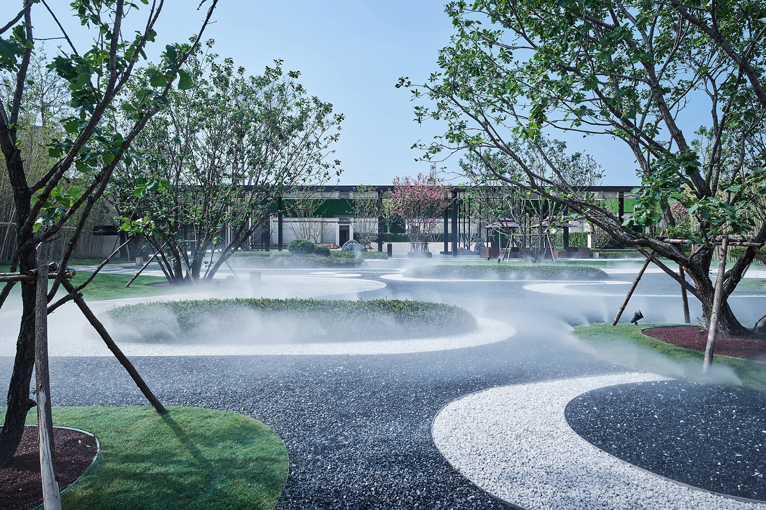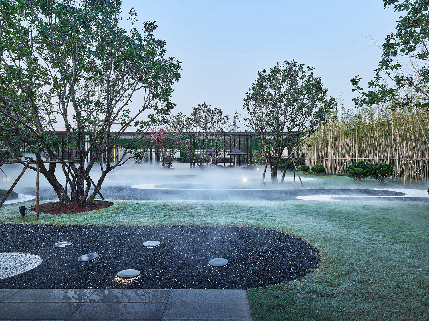 坤達·江山筑,樹影清暉,云靄繚繞;以疏朗飄渺的姿態,追尋中式園林中的逸興遄飛和山水之意。
