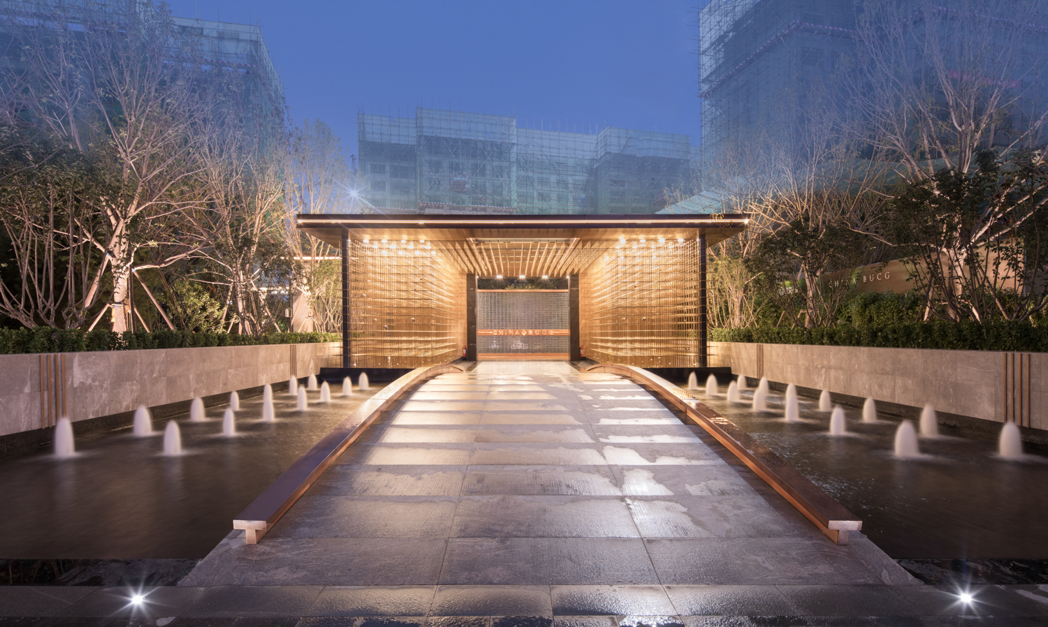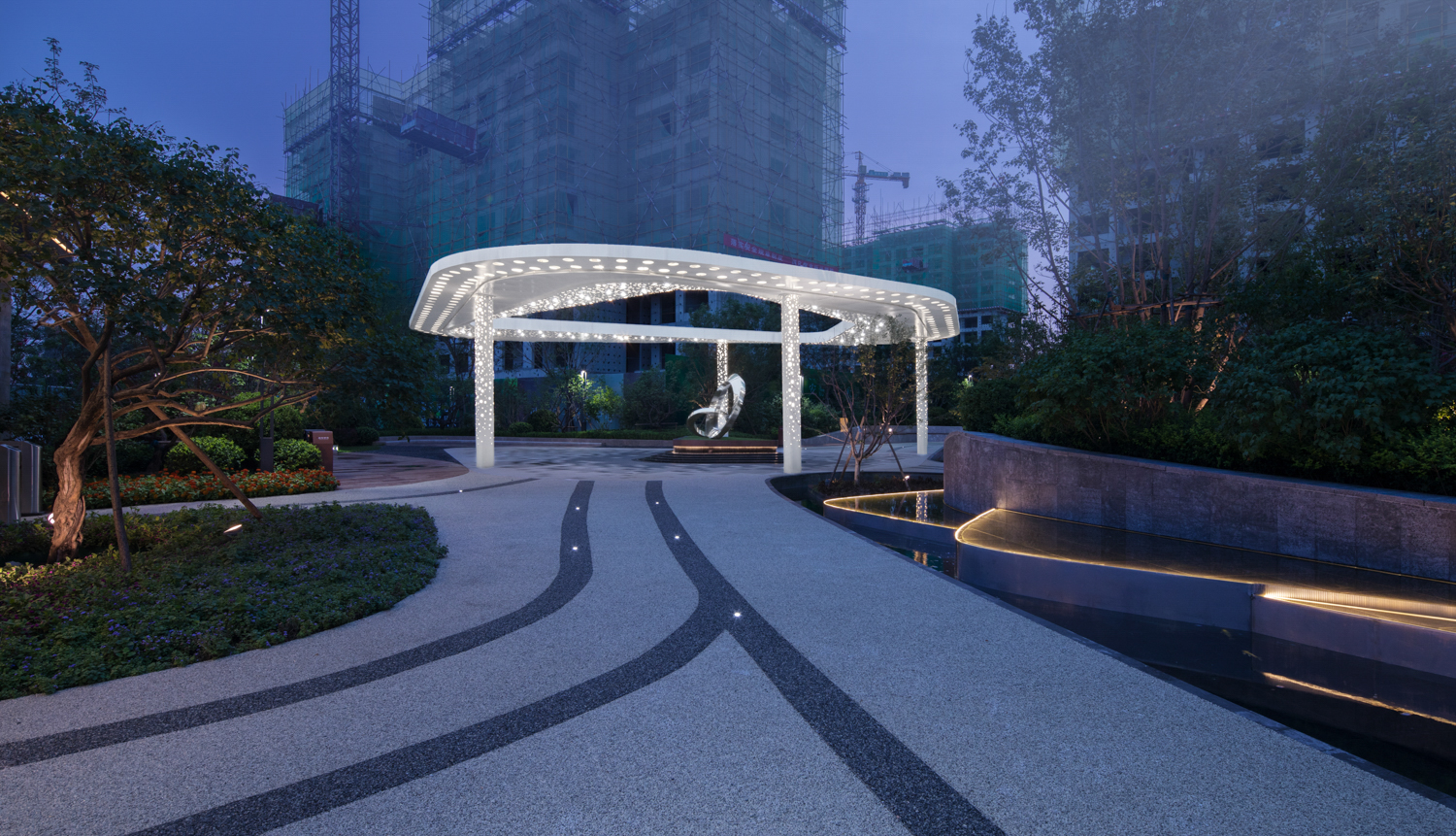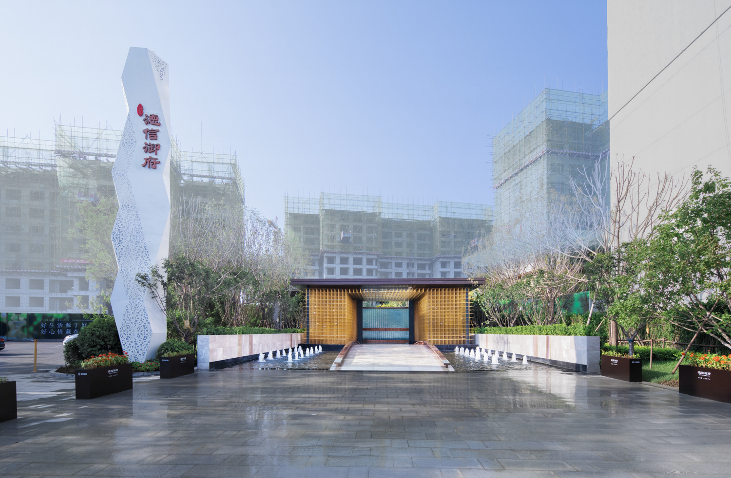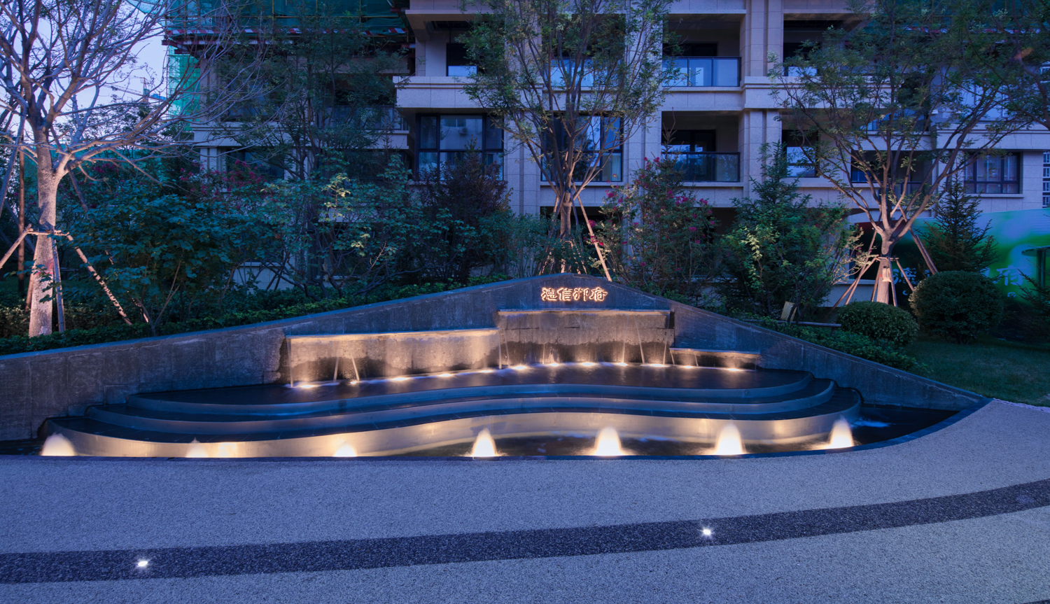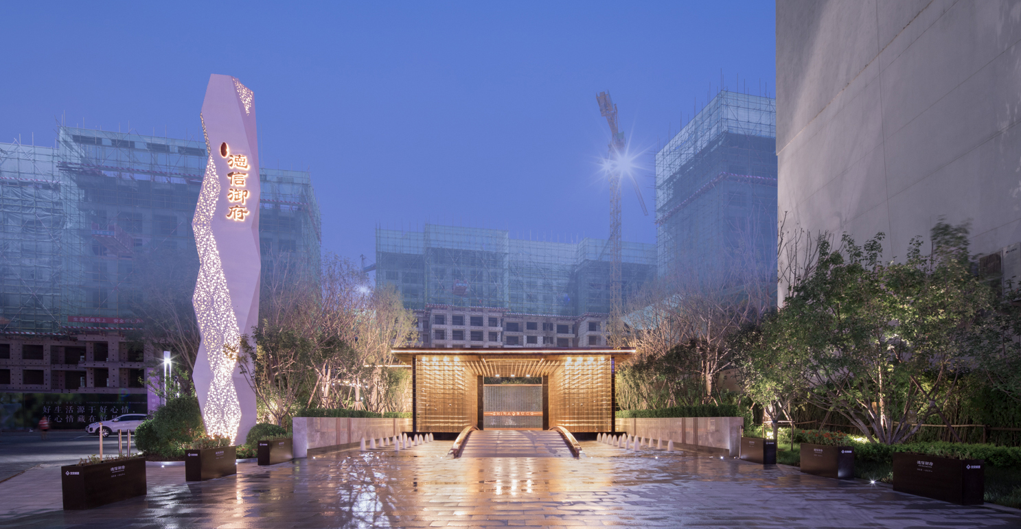 德信御府以花燈和皮影為切入點(diǎn),尋找其中燈影相依、光影交融的特點(diǎn),將中式建筑元素和現(xiàn)代建筑相結(jié)合,以幾何線條、對稱設(shè)計(jì)、金字塔臺(tái)階式構(gòu)圖等手法,將涿州的光影文化融入其中,實(shí)現(xiàn)了從景觀印象到景觀精神的轉(zhuǎn)變。