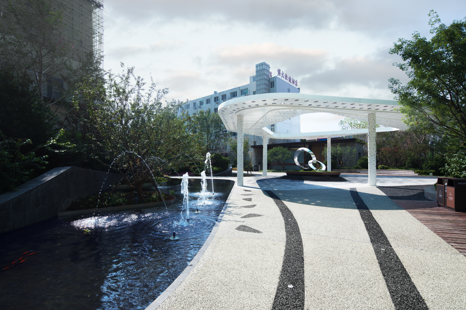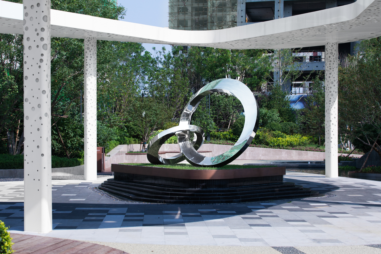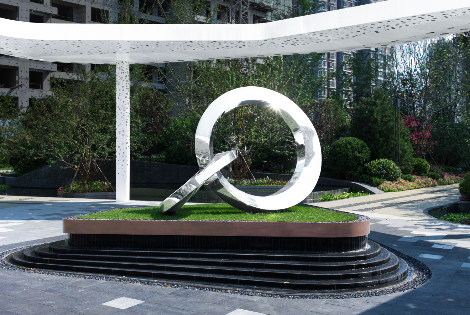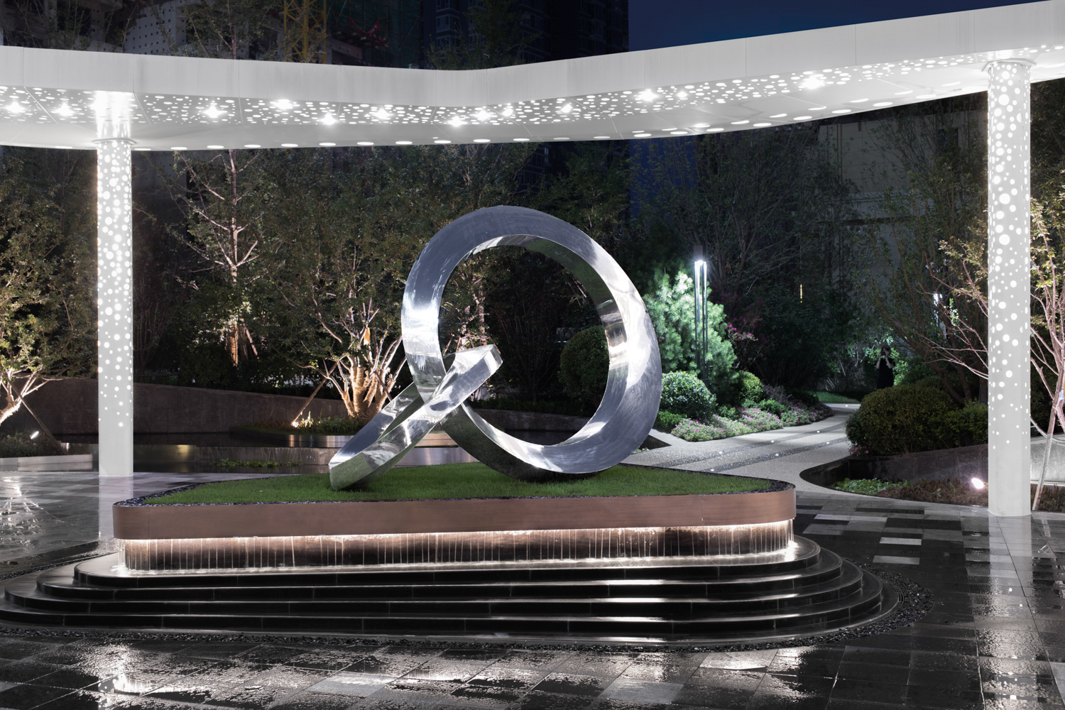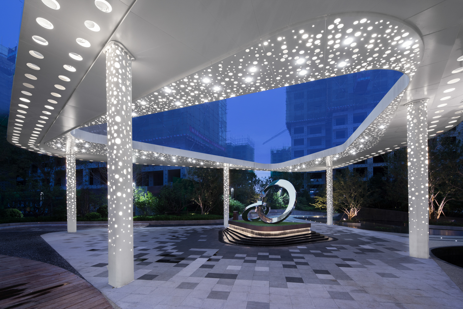 德信御府以花燈和皮影為切入點(diǎn),尋找其中燈影相依、光影交融的特點(diǎn),將中式建筑元素和現(xiàn)代建筑相結(jié)合,以幾何線條、對稱設(shè)計(jì)、金字塔臺(tái)階式構(gòu)圖等手法,將涿州的光影文化融入其中,實(shí)現(xiàn)了從景觀印象到景觀精神的轉(zhuǎn)變。