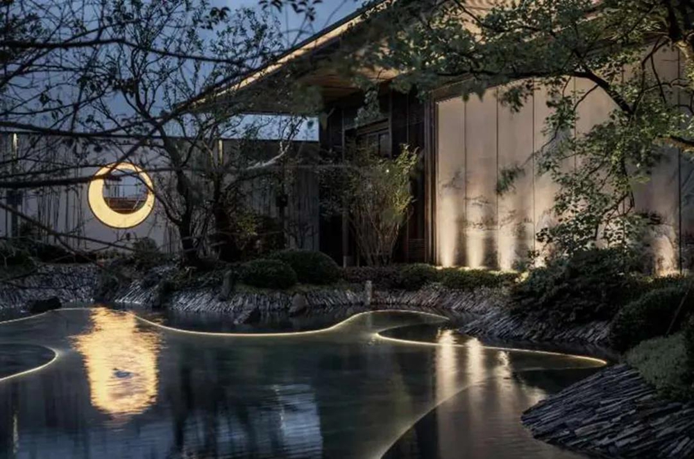地面水景采用光面中國黑池底,以片巖做池壁,搭配不銹鋼條收邊及暖色系燈帶,使水景更加自然的同時(shí)也賦予了部分現(xiàn)代化元素,營造出了超然寧靜的景觀氛圍。