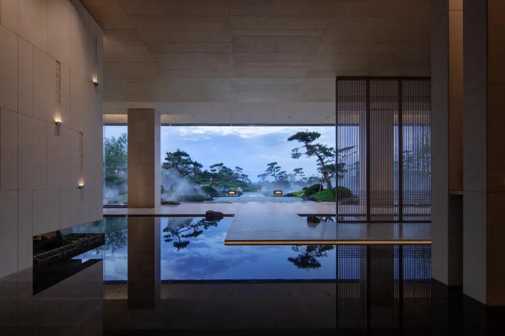 為了讓售樓部前的無邊際水整體空間更具美感,我們采用特景樹配合水上霧森,通過水池倒映出建筑的靜與水紋的動。當(dāng)居者行至于此,從內(nèi)看,是一處至清至美的風(fēng)景;從外看,也是一個(gè)凈池,洗凈浮華、神清氣爽。這正是我們想營造出的情景合一,回歸生活本真的意境。