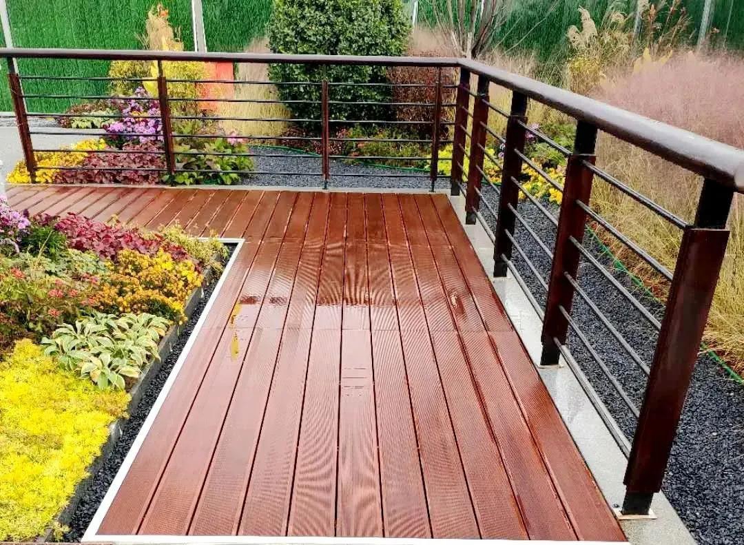 為了保證木地板觀感和品質(zhì),我們在選材上采用了更為天然質(zhì)感的竹木地板。焊接龍骨后采用不銹鋼卡扣進行安裝,保證竹木地板安裝無釘眼、整齊美觀。竹木地板安裝完成后,以鋁合金收邊條對竹木地板進行手邊收口,保證景觀質(zhì)感整潔美觀。