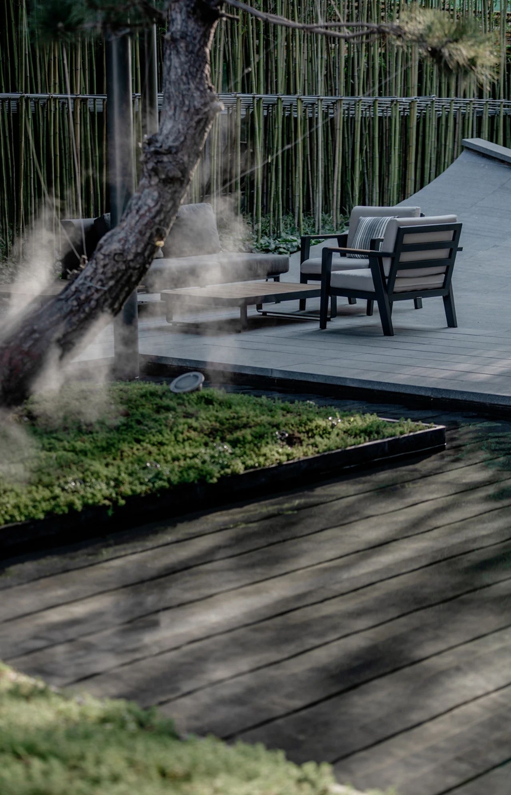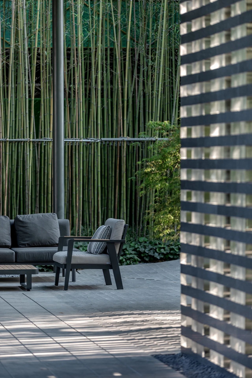 特選的中式黑松搭配精心打磨而出的山水紋理石材,裁剪出光與影。中式疊水設計,讓樹影投射與墻、地、水三面,姿態各異,景觀空間的風格感躍然紙上,讓居者提前感受到如著名文學家林語堂筆下理想的住宅體驗“園中有院,院中有樹,樹上見天,天中有月”的生活意境。